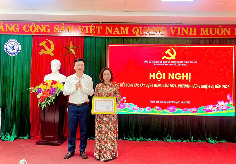 Đồng chí Hồ Thắng - Bí thư Đảng uỷ, Giám đốc Sở KH&CN và đồng chí Trần Thị Thuỳ Yên - Phó Bí thư Đảng uỷ, Phó Giám đốc Sở KH&CN trao Giấy khen thưởng cho các đảng viên có thành tích nổi bật trong năm 2024